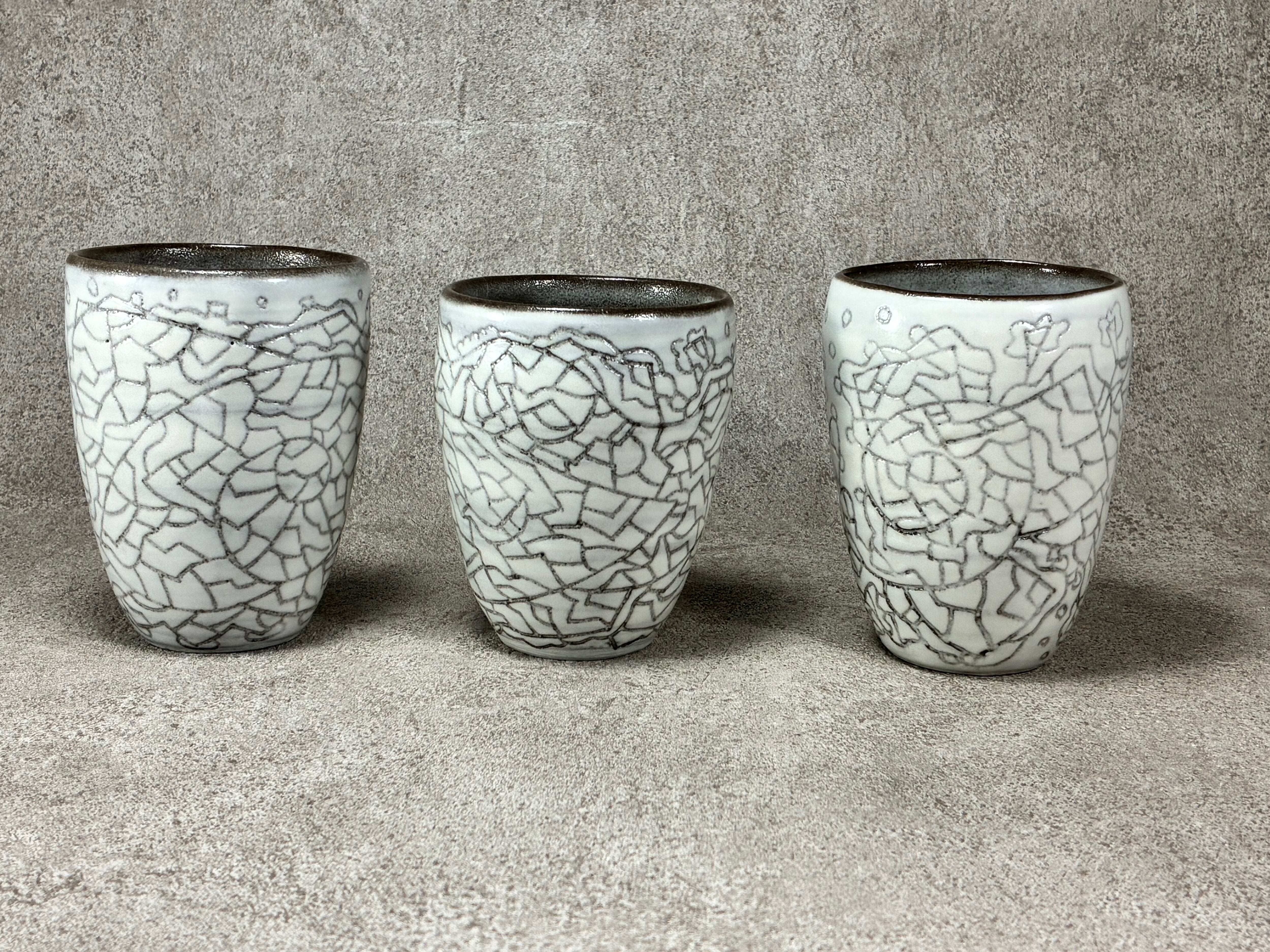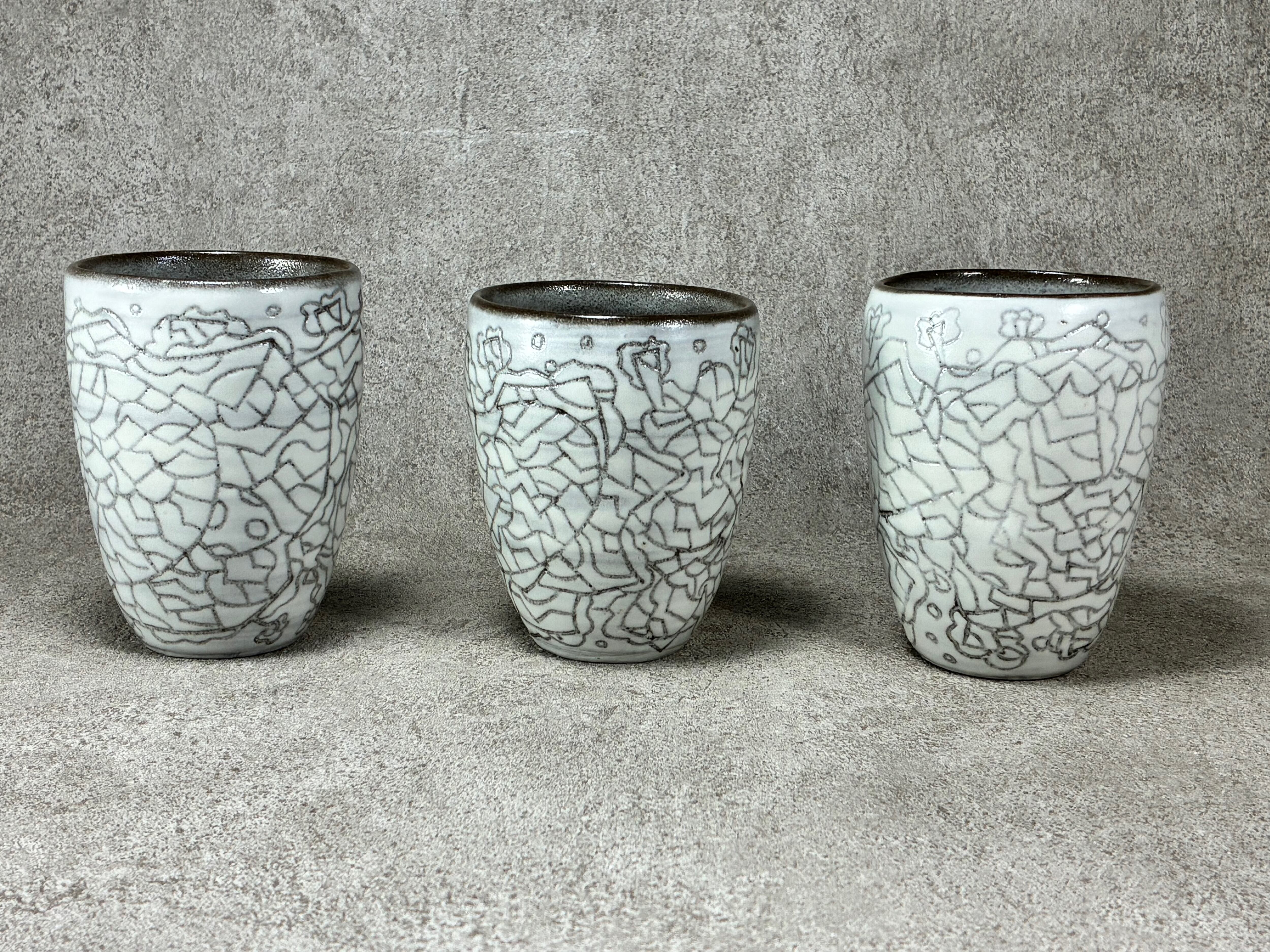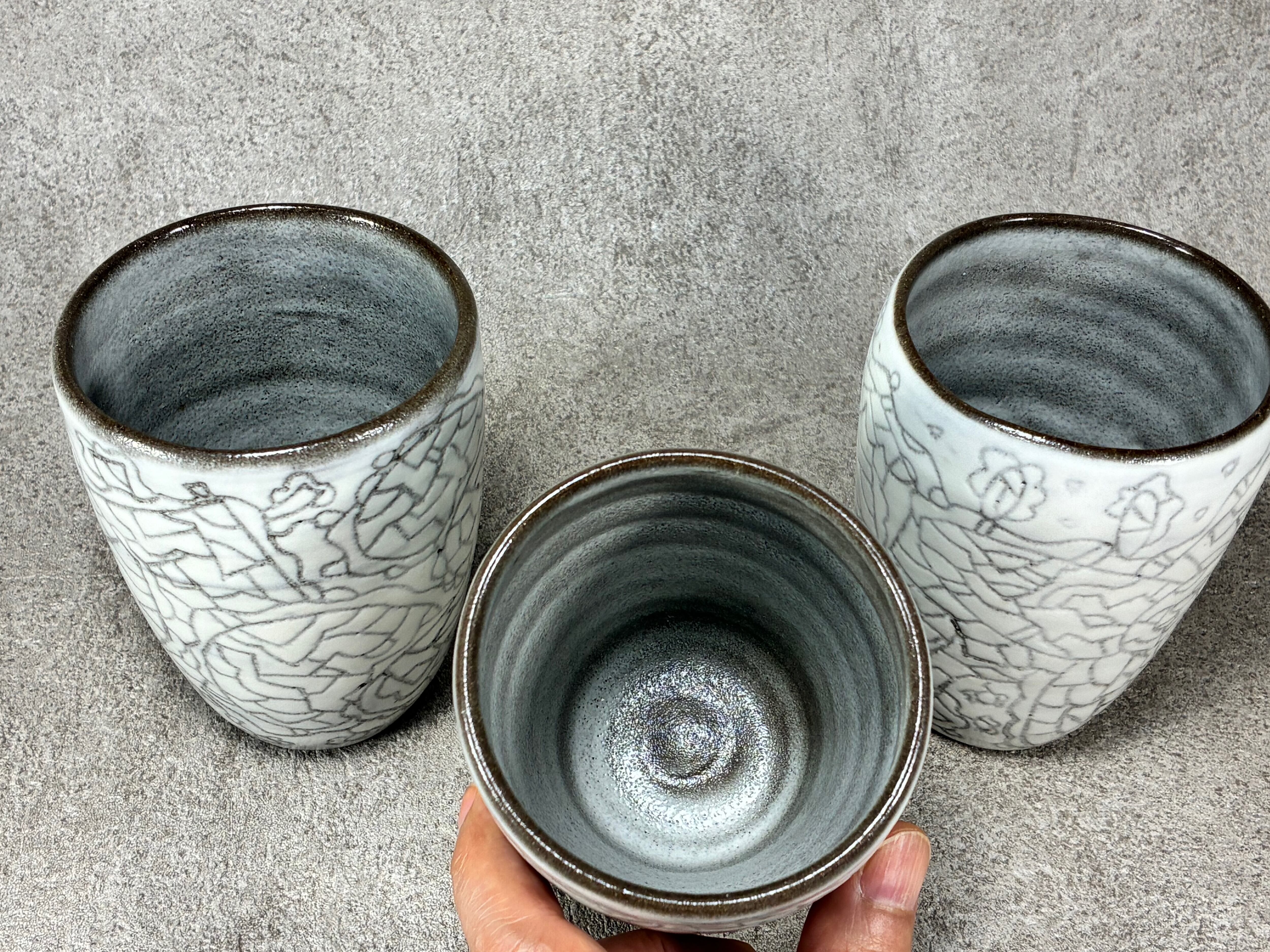 黒い土に白化粧土を塗り掻き落としの技法で線画を施しています