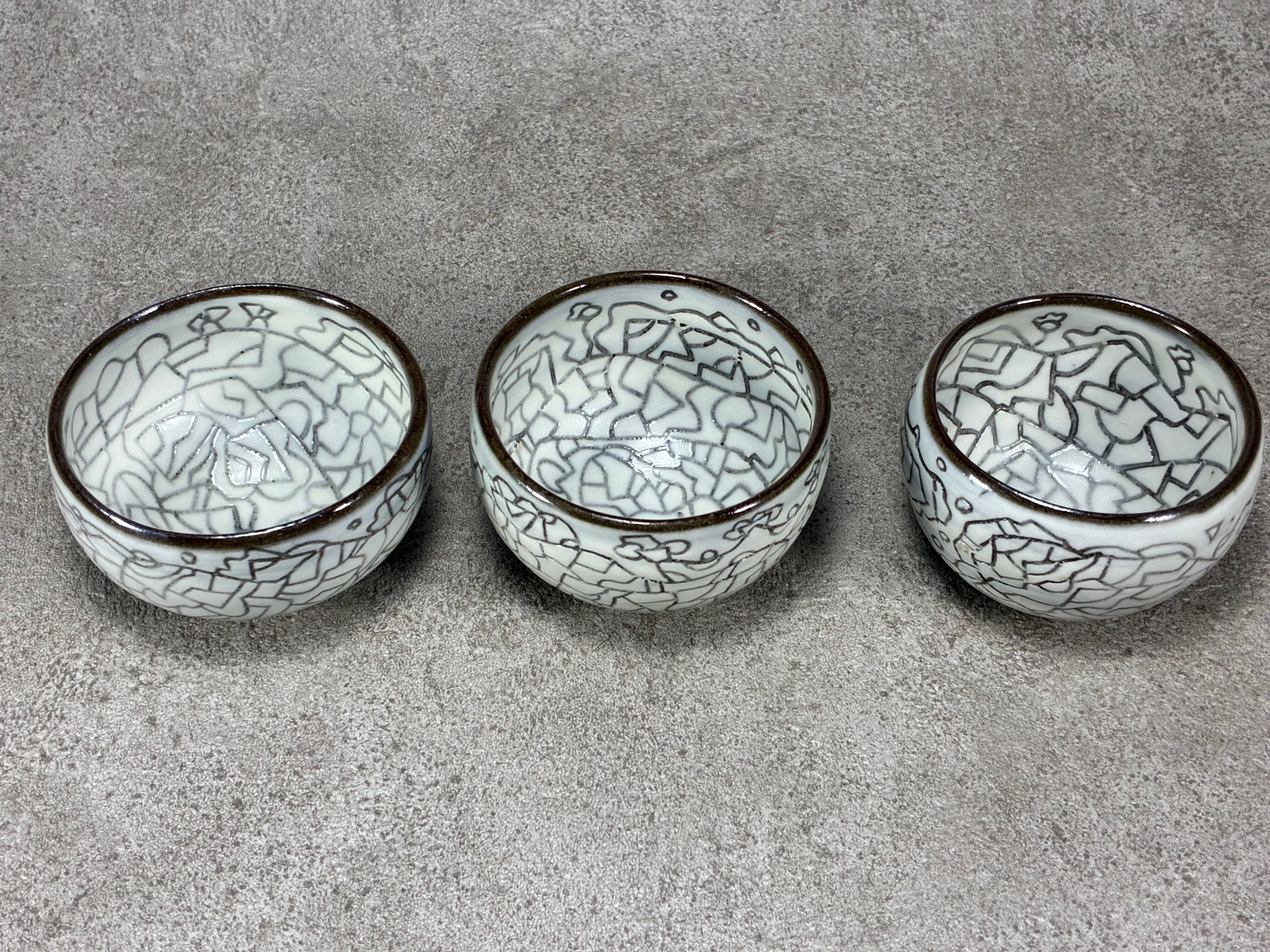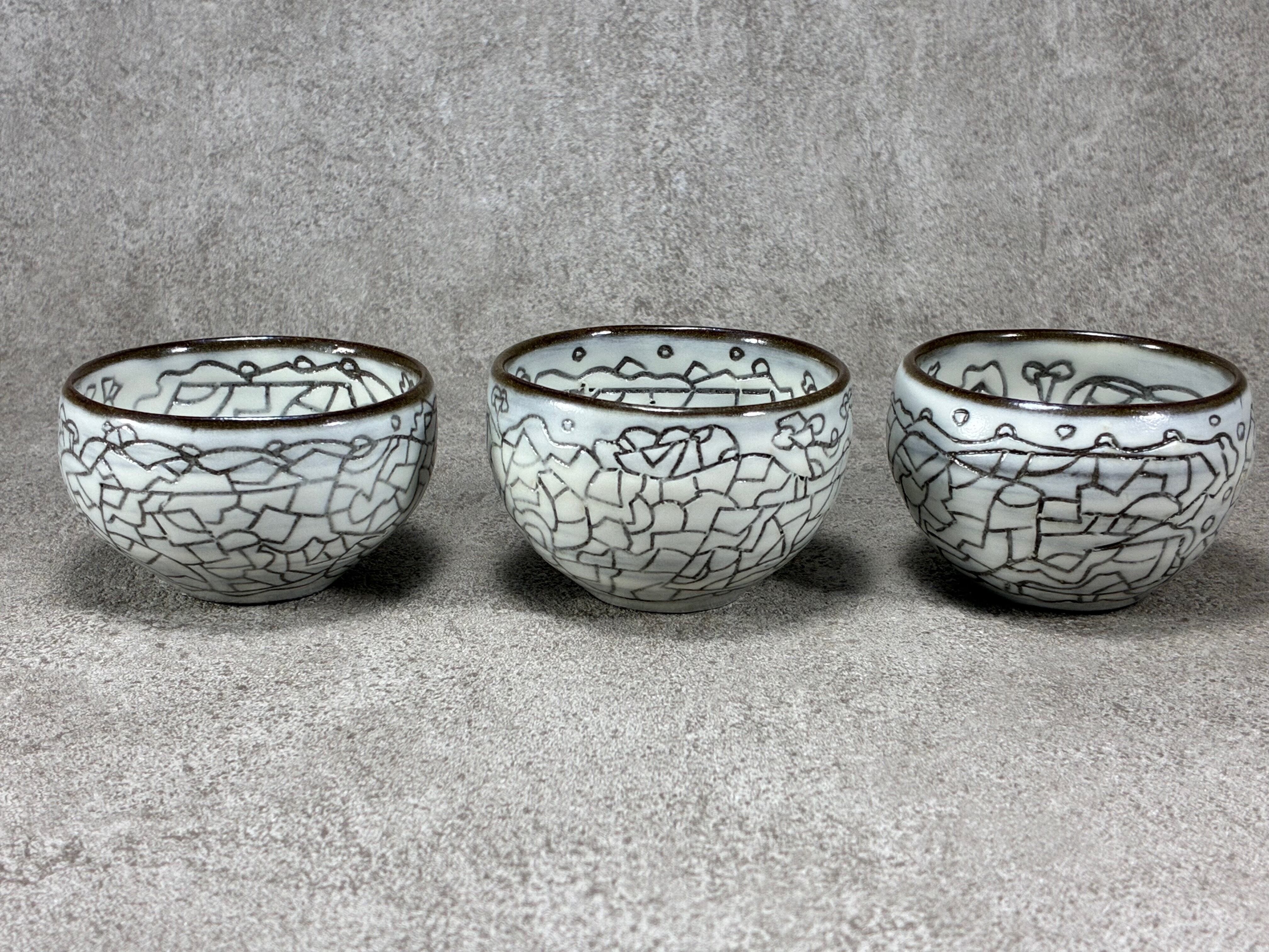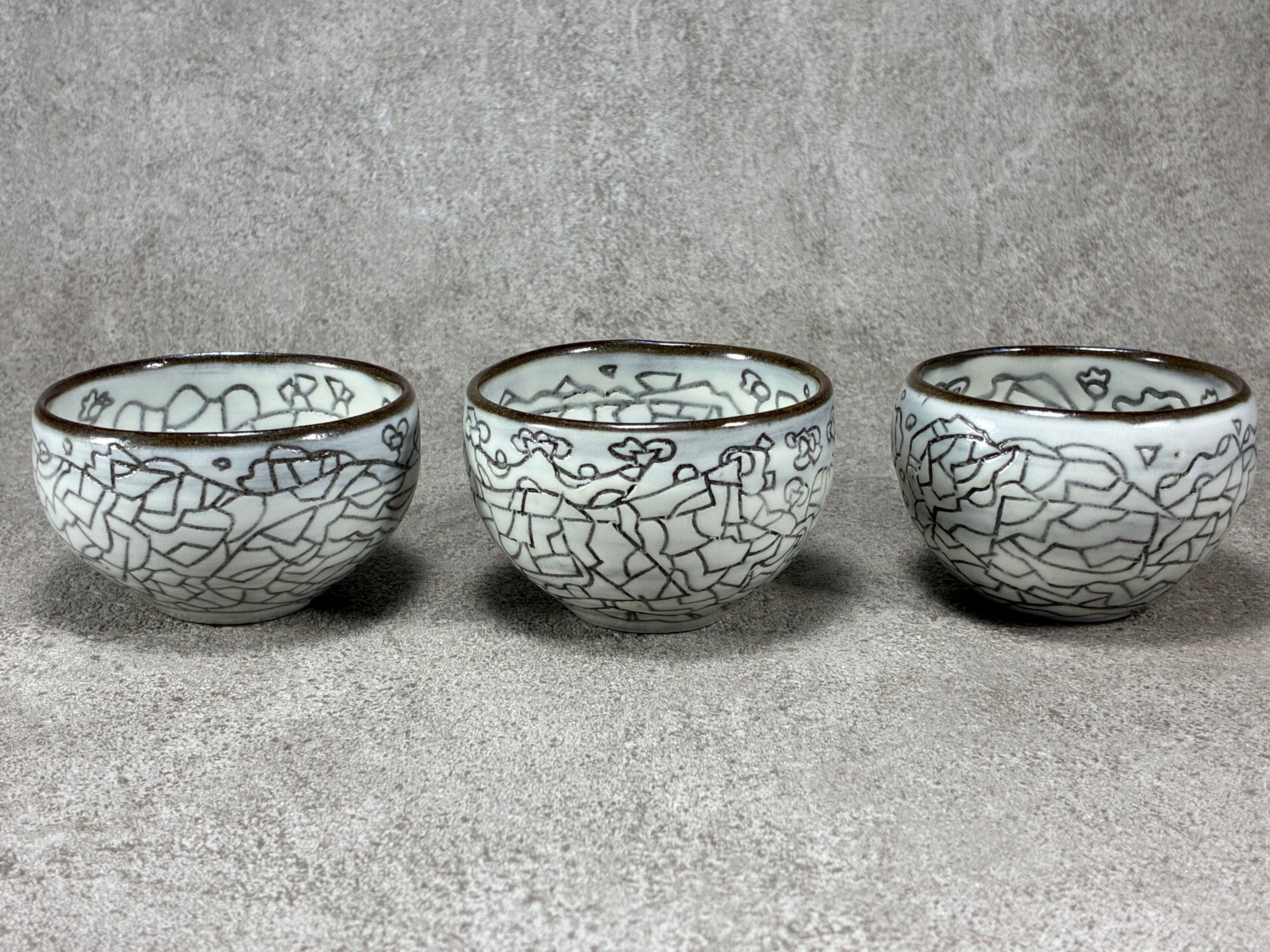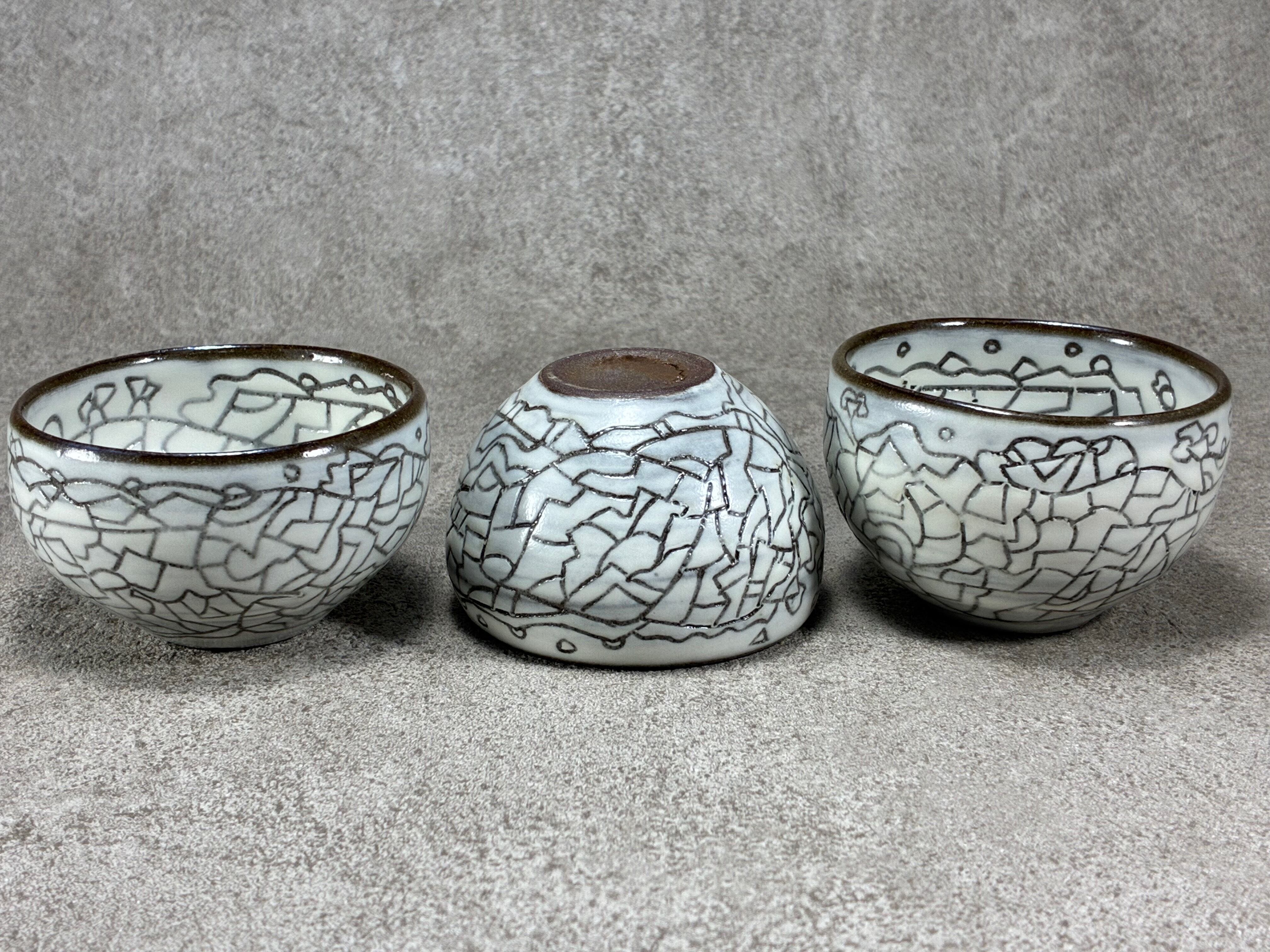 黒い土に白化粧土を塗り掻き落としの技法で線画を施しています