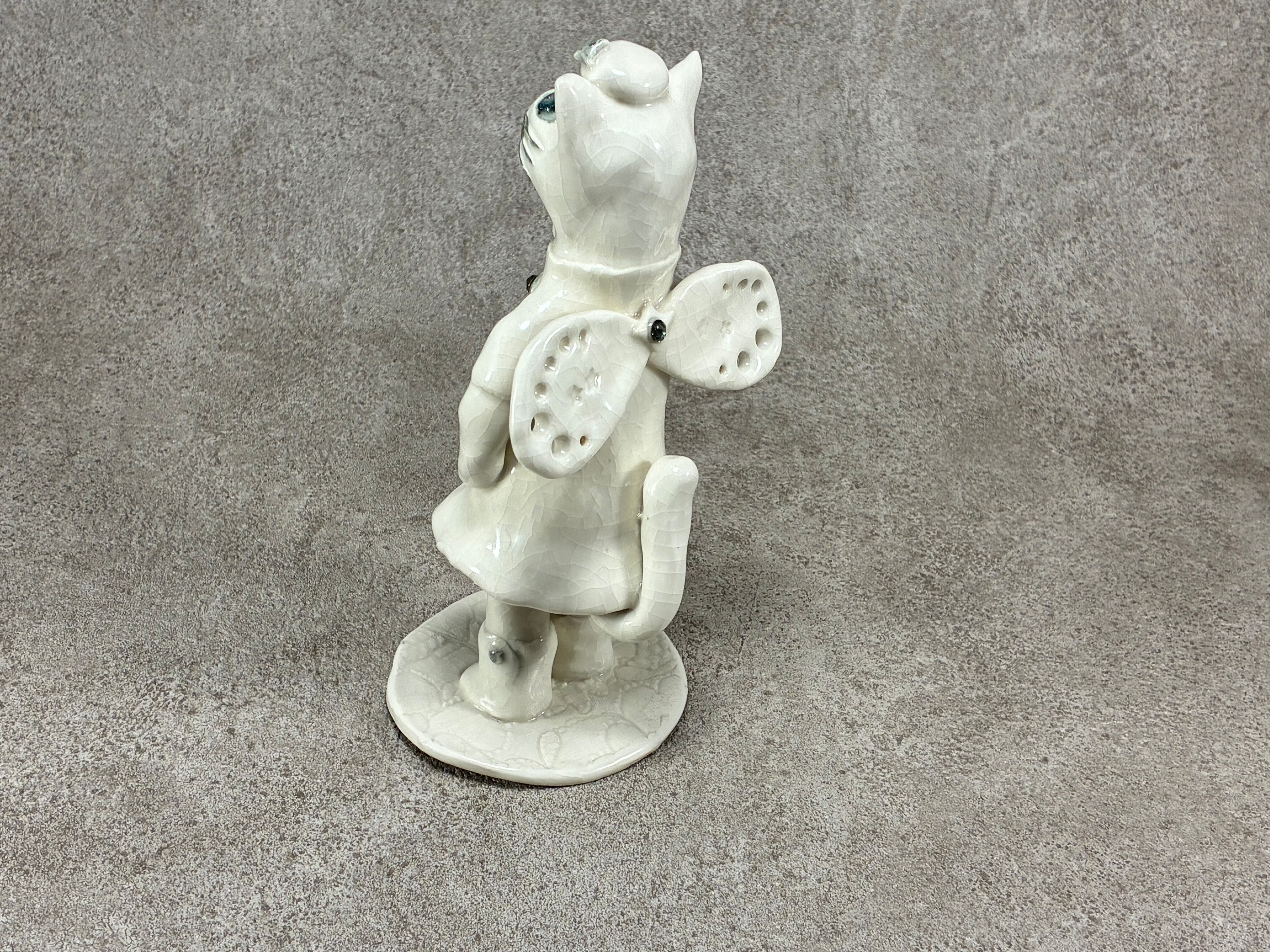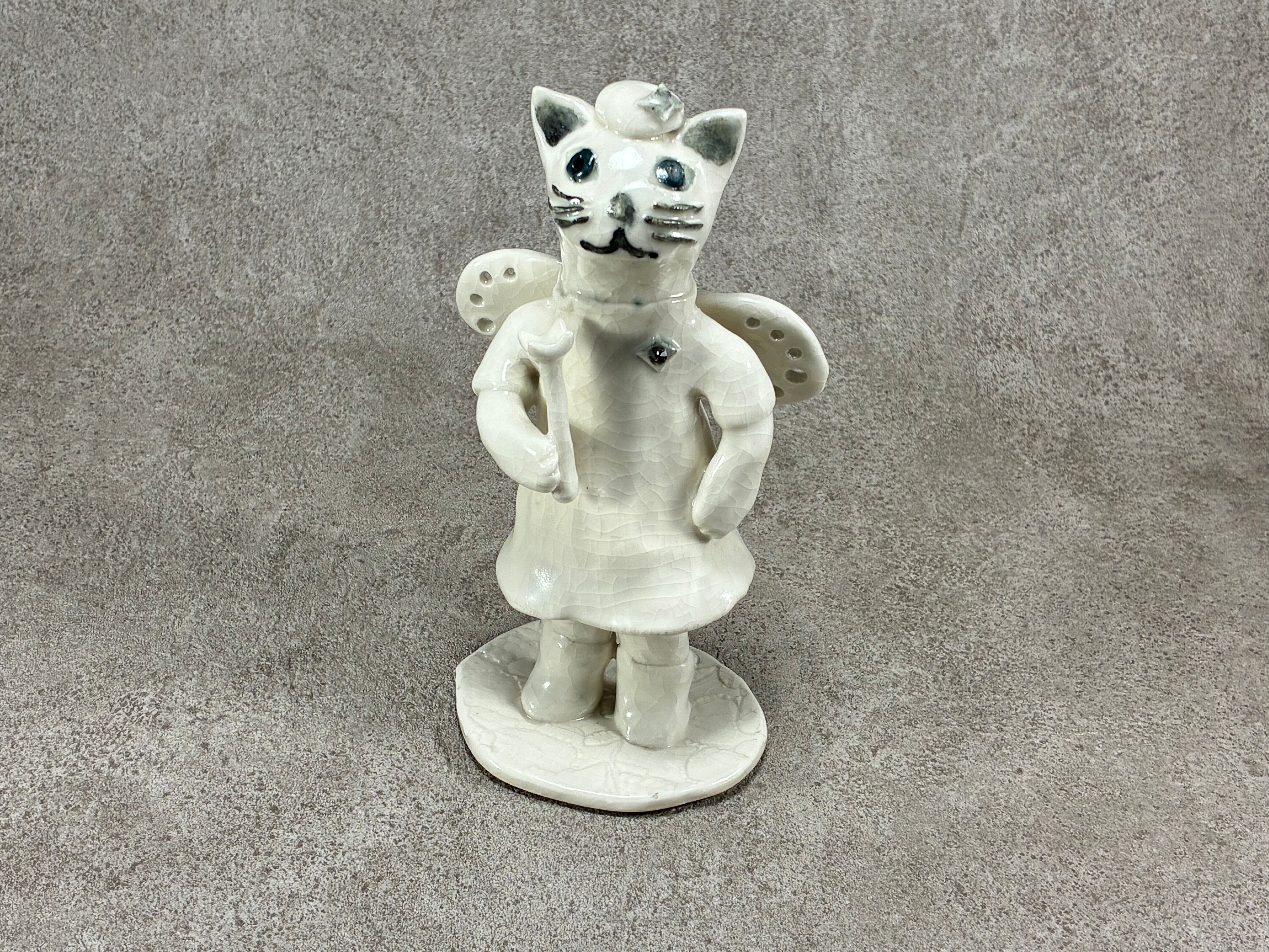 天使に憧れを抱く可愛らしい「ネコとウサギ」の陶の置物が登場しました。オフホワイトの衣装に身を包み、背中には優雅な羽がついています。手づくりならではの温かみと独特のデザインが魅力的で、どんなインテリアにもぴったり調和します。