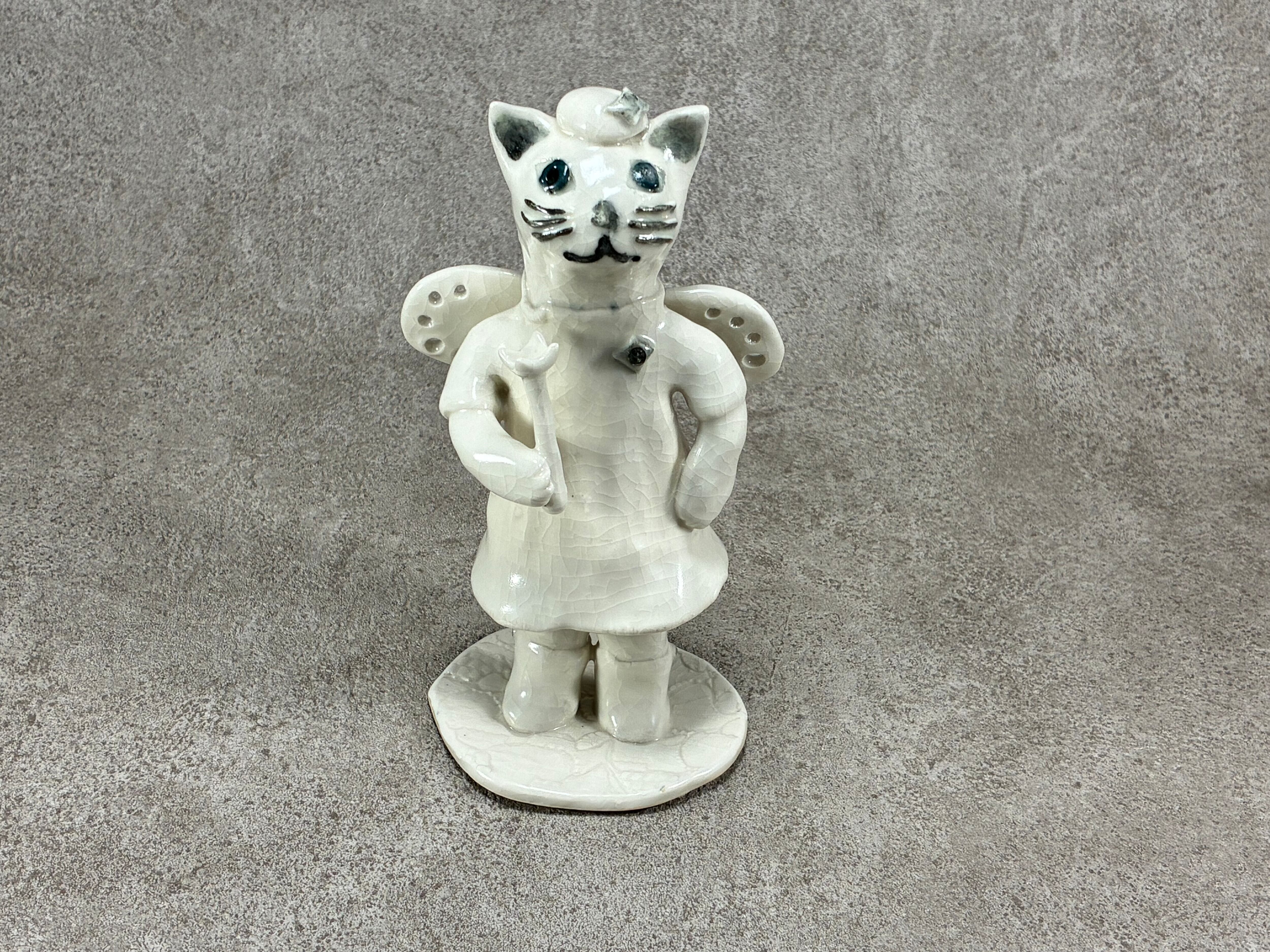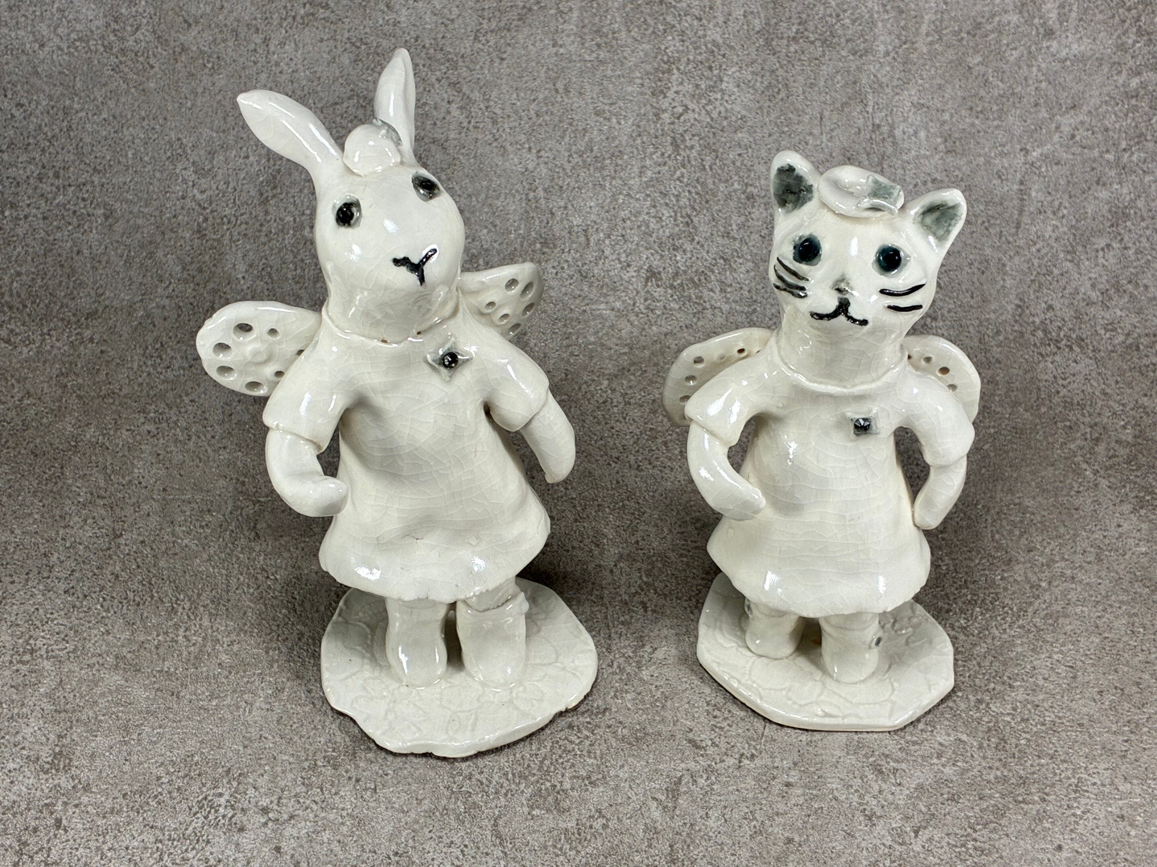 天使に憧れているネコとウサギ(陶の置物)
