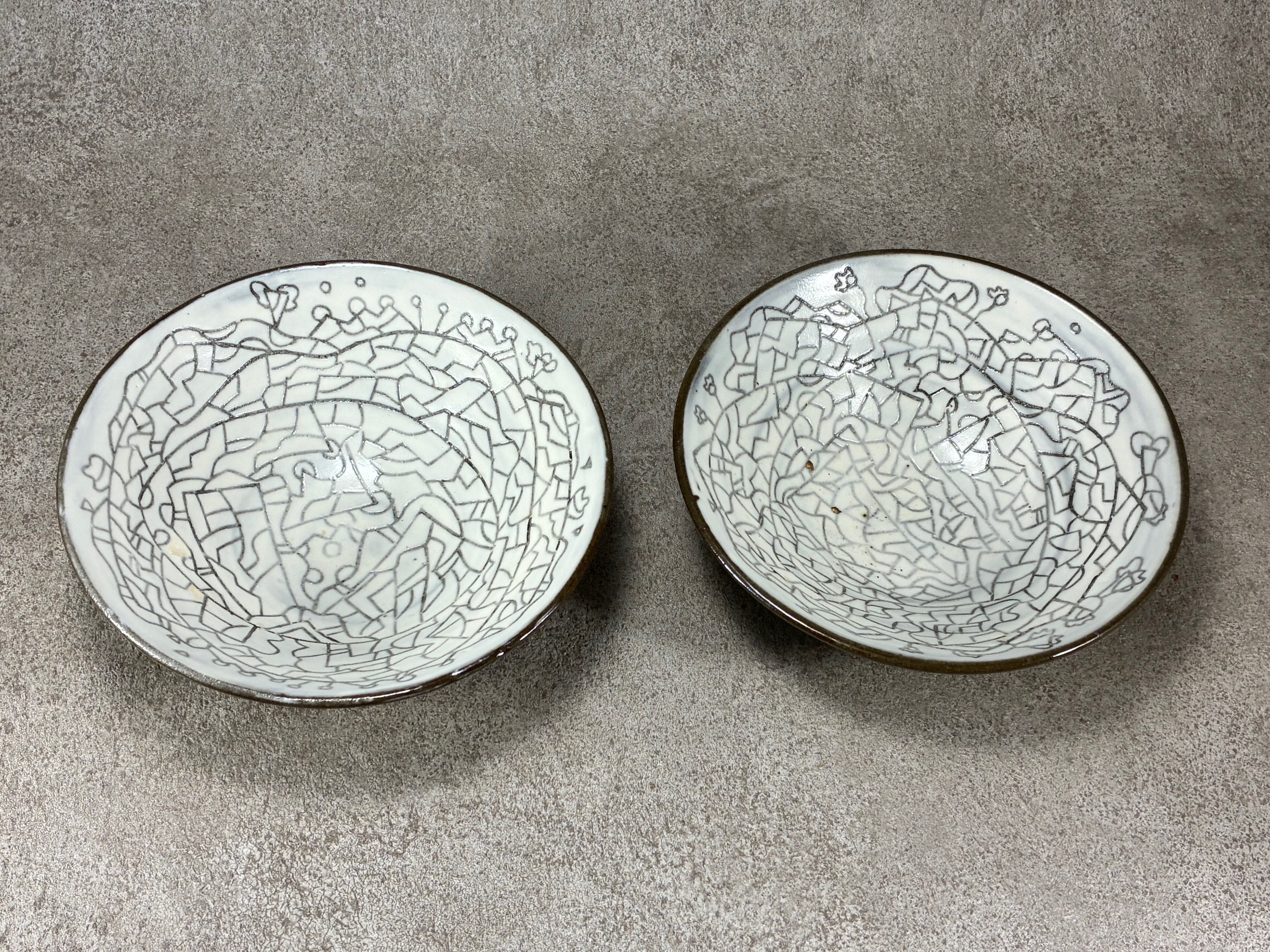 黒い土に白化粧土を施し、掻き落としの技法で個性的なラインを描いています。一つ一つ、異なる表情を持った器が生まれ、そのすべてが唯一無二の作品です。